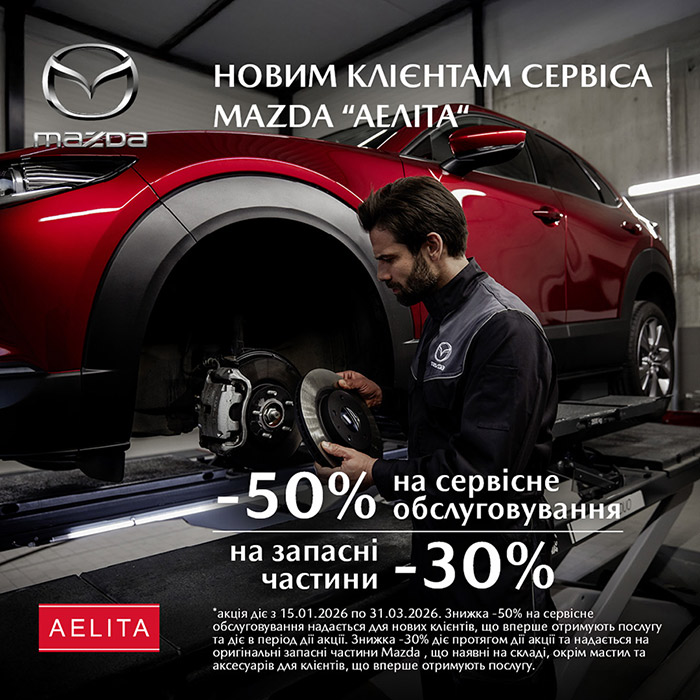 «Знижка 50% на сервісні роботи* в автоцентрі Mazda Аеліта та 30% на запчастини** для нових клієнтів Mazda»:
